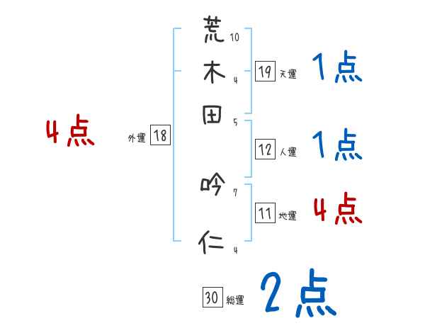 天運![]() | 荒木田吟仁さんの天運は19画の1つ星!優れた才能を持ちますが、協調性が足りないことも。周りの人と協力する事を意識しましょう。 家系が持つ宿命的な運勢を表します。祖先から受け継いだ苗字ですので自分の力が及びません。家柄を象徴します。 |