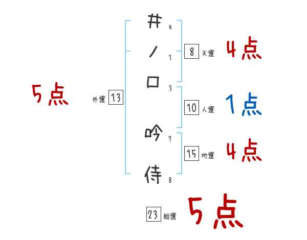 総運![]() | 井ノ口吟侍さんの総運は23画の5つ星!想像力に優れ活力がある。一代で成功し名誉を手に入れる。 あなたの人生を表す1番重要な運勢です。生涯を通じて影響する総合運となり、主に50歳以降の晩年期に影響を及ぼします。 |