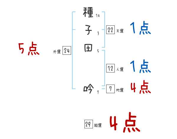 天運![]() | 種子田吟さんの天運は22画の1つ星!努力することが苦手ないっぽう手先が器用。芸術性にも優れる。 家系が持つ宿命的な運勢を表します。祖先から受け継いだ苗字ですので自分の力が及びません。家柄を象徴します。 |