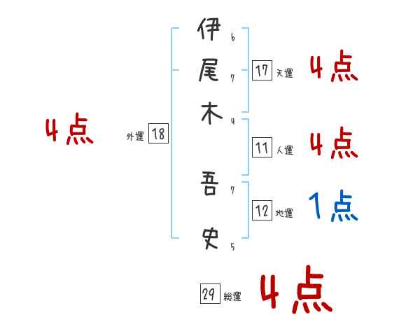 天運![]() | 伊尾木吾史さんの天運は17画の4つ星!積極的な行動力。地位を気づき財産を手に入れる。純粋な心と直感力。 家系が持つ宿命的な運勢を表します。祖先から受け継いだ苗字ですので自分の力が及びません。家柄を象徴します。 |