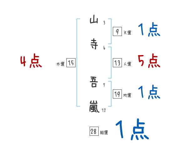 天運![]() | 山寺吾嵐さんの天運は9画の1つ星!消極的で才能を発揮することが苦手なことも。周りの意見に耳を傾けましょう。 家系が持つ宿命的な運勢を表します。祖先から受け継いだ苗字ですので自分の力が及びません。家柄を象徴します。 |
