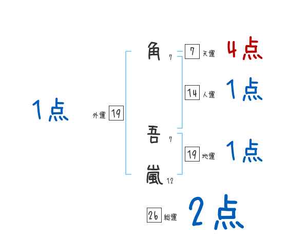 外運![]() | 角吾嵐さんの外運は19画の1つ星!優れた才能を持ちますが、協調性が足りないことも。周りの人と協力する事を意識しましょう。 生活面を象徴する運勢です。外部から受ける影響力を表し、結婚運、家庭運や職場、環境への順応性を表します。 |