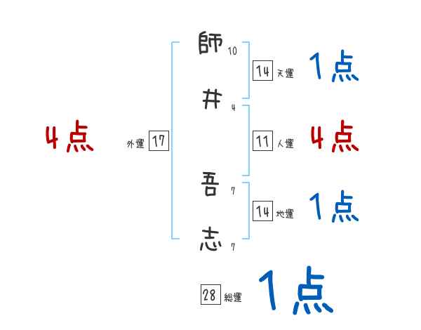 外運![]() | 師井吾志さんの外運は17画の4つ星!積極的な行動力。地位を気づき財産を手に入れる。純粋な心と直感力。 生活面を象徴する運勢です。外部から受ける影響力を表し、結婚運、家庭運や職場、環境への順応性を表します。 |