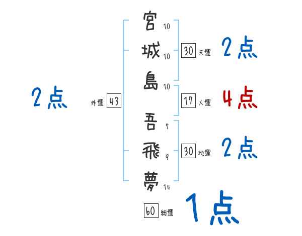 外運![]() | 宮城島吾飛夢さんの外運は43画の2つ星!頑固な性格で独立心が強いかも。やや非現実的で浪費に注意しましょう。 生活面を象徴する運勢です。外部から受ける影響力を表し、結婚運、家庭運や職場、環境への順応性を表します。 |