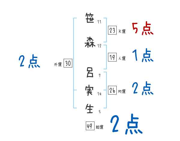 総運![]() | 笹森呂実生さんの総運は49画の2つ星!不安定な性格で明暗がある人生。周りの人には支援されやすい。 あなたの人生を表す1番重要な運勢です。生涯を通じて影響する総合運となり、主に50歳以降の晩年期に影響を及ぼします。 |