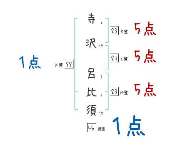 天運![]() | 寺沢呂比須さんの天運は23画の5つ星!想像力に優れ活力がある。一代で成功し名誉を手に入れる。 家系が持つ宿命的な運勢を表します。祖先から受け継いだ苗字ですので自分の力が及びません。家柄を象徴します。 |