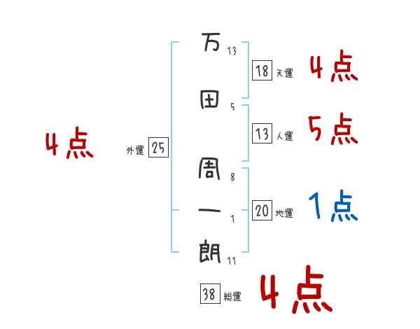 天運![]() | 万田周一朗さんの天運は18画の4つ星!情熱的で剛気。忍耐力があり信頼される。 家系が持つ宿命的な運勢を表します。祖先から受け継いだ苗字ですので自分の力が及びません。家柄を象徴します。 |