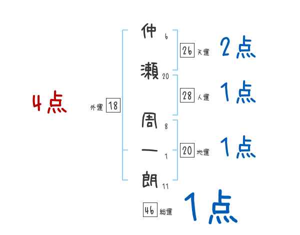 総運![]() | 仲瀬周一朗さんの総運は46画の1つ星!迷走することが多く苦労するかも。目先のことにとらわれないように。 あなたの人生を表す1番重要な運勢です。生涯を通じて影響する総合運となり、主に50歳以降の晩年期に影響を及ぼします。 |