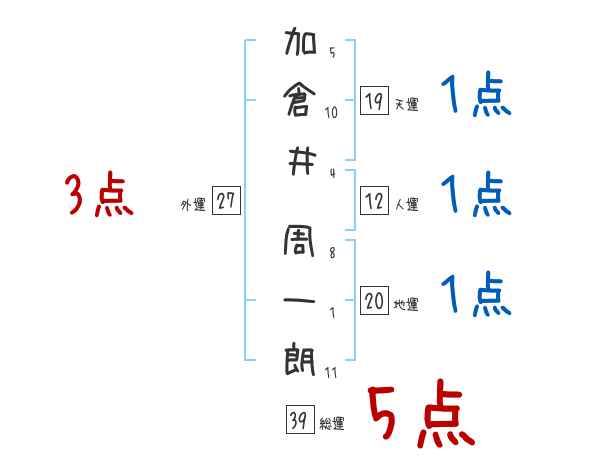 総運![]() | 加倉井周一朗さんの総運は39画の5つ星!社交性に優れ人望が厚い。人の上に立ち成功する。 あなたの人生を表す1番重要な運勢です。生涯を通じて影響する総合運となり、主に50歳以降の晩年期に影響を及ぼします。 |