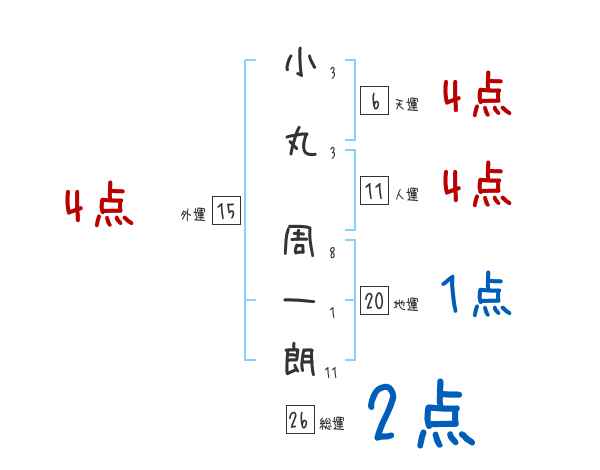 天運![]() | 小丸周一朗さんの天運は6画の4つ星!慎重な努力家で信頼を得る。誠実な精神で向上心に優れる。 家系が持つ宿命的な運勢を表します。祖先から受け継いだ苗字ですので自分の力が及びません。家柄を象徴します。 |