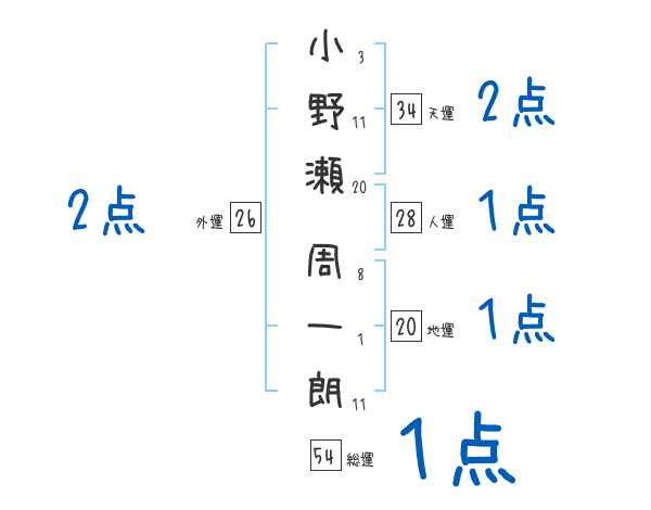外運![]() | 小野瀬周一朗さんの外運は26画の2つ星!波瀾万丈かも。信頼できる人を大事にしましょう。 生活面を象徴する運勢です。外部から受ける影響力を表し、結婚運、家庭運や職場、環境への順応性を表します。 |