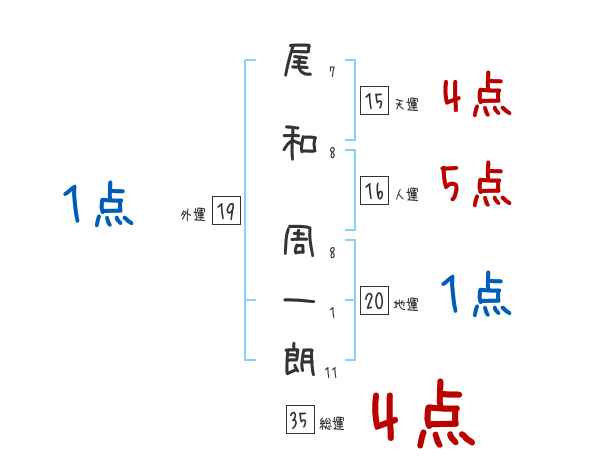 総運![]() | 尾和周一朗さんの総運は35画の4つ星!温厚な性格で感受性が高い。穏和な性格で人望が厚い。 あなたの人生を表す1番重要な運勢です。生涯を通じて影響する総合運となり、主に50歳以降の晩年期に影響を及ぼします。 |