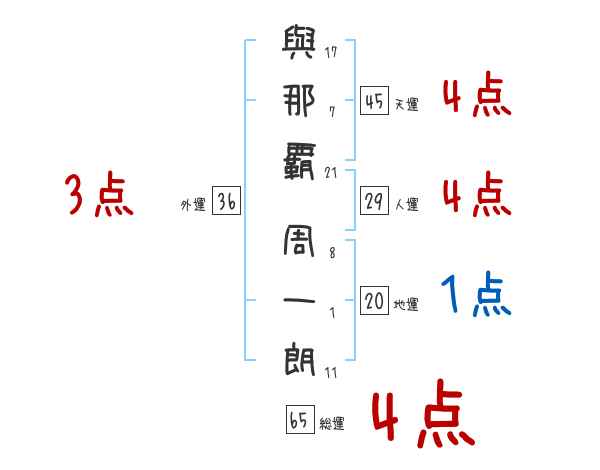 外運![]() | 與那覇周一朗さんの外運は36画の3つ星!先見性が豊かです。多少神経質で苦労することも。 生活面を象徴する運勢です。外部から受ける影響力を表し、結婚運、家庭運や職場、環境への順応性を表します。 |