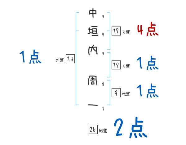 天運![]() | 中垣内周一さんの天運は17画の4つ星!積極的な行動力。地位を気づき財産を手に入れる。純粋な心と直感力。 家系が持つ宿命的な運勢を表します。祖先から受け継いだ苗字ですので自分の力が及びません。家柄を象徴します。 |
