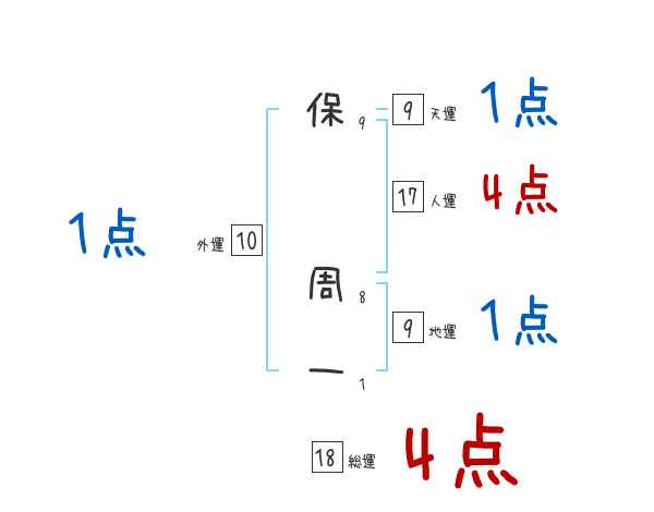 天運![]() | 保周一さんの天運は9画の1つ星!消極的で才能を発揮することが苦手なことも。周りの意見に耳を傾けましょう。 家系が持つ宿命的な運勢を表します。祖先から受け継いだ苗字ですので自分の力が及びません。家柄を象徴します。 |