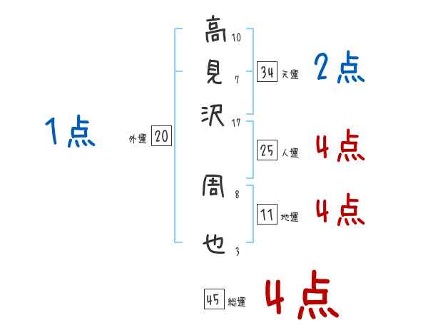 天運![]() | 高見沢周也さんの天運は34画の2つ星!独創性に優れるが、自尊心が強く災難に注意しましょう。 家系が持つ宿命的な運勢を表します。祖先から受け継いだ苗字ですので自分の力が及びません。家柄を象徴します。 |