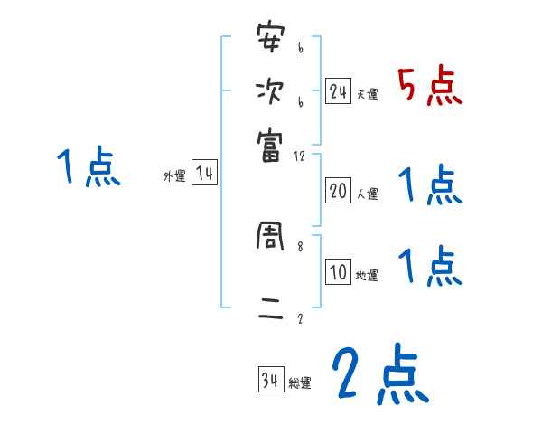 天運![]() | 安次富周二さんの天運は24画の5つ星!家庭運が良く順調な人生。金運にも恵まれる。 家系が持つ宿命的な運勢を表します。祖先から受け継いだ苗字ですので自分の力が及びません。家柄を象徴します。 |