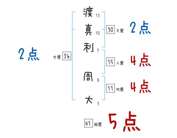 天運![]() | 渡真利周大さんの天運は30画の2つ星!浮き沈みの激しさに注意しましょう。 家系が持つ宿命的な運勢を表します。祖先から受け継いだ苗字ですので自分の力が及びません。家柄を象徴します。 |