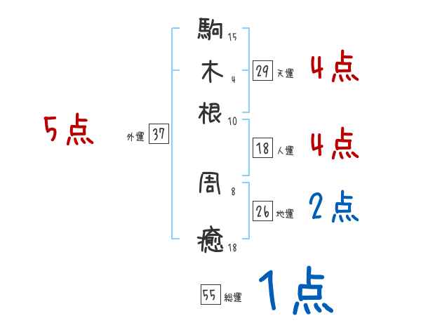 天運![]() | 駒木根周癒さんの天運は29画の4つ星!完全主義で才能がある。厳格な心の持ち主。 家系が持つ宿命的な運勢を表します。祖先から受け継いだ苗字ですので自分の力が及びません。家柄を象徴します。 |