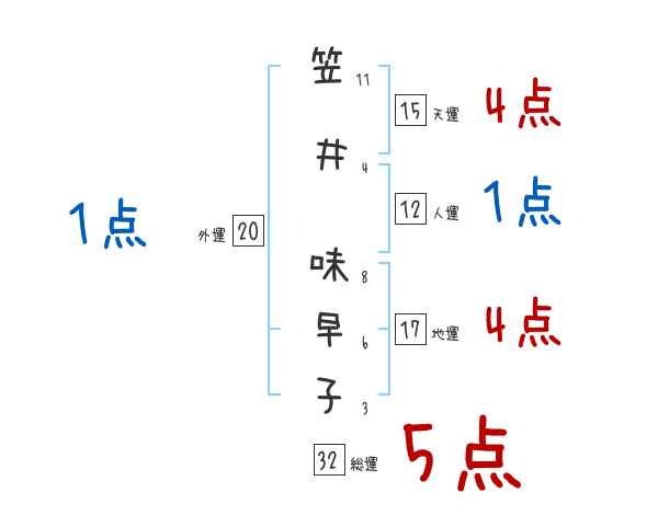 総運![]() | 笠井味早子さんの総運は32画の5つ星!柔軟性があり成功する。チャンスが多く金運が良い。 あなたの人生を表す1番重要な運勢です。生涯を通じて影響する総合運となり、主に50歳以降の晩年期に影響を及ぼします。 |