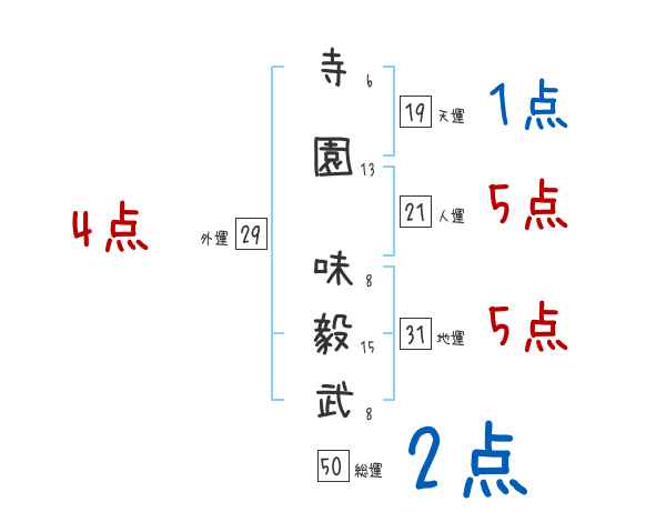外運![]() | 寺園味毅武さんの外運は29画の4つ星!完全主義で才能がある。厳格な心の持ち主。 生活面を象徴する運勢です。外部から受ける影響力を表し、結婚運、家庭運や職場、環境への順応性を表します。 |