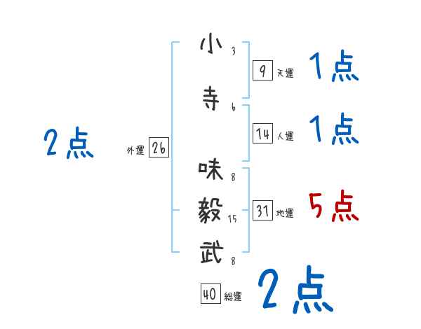 天運![]() | 小寺味毅武さんの天運は9画の1つ星!消極的で才能を発揮することが苦手なことも。周りの意見に耳を傾けましょう。 家系が持つ宿命的な運勢を表します。祖先から受け継いだ苗字ですので自分の力が及びません。家柄を象徴します。 |