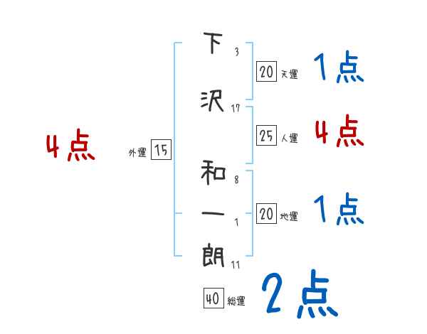 外運![]() | 下沢和一朗さんの外運は15画の4つ星!人徳があり出世する。順調に物事を進め円満な人生。 生活面を象徴する運勢です。外部から受ける影響力を表し、結婚運、家庭運や職場、環境への順応性を表します。 |