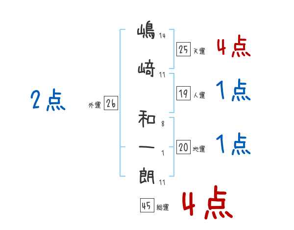 外運![]() | 嶋﨑和一朗さんの外運は26画の2つ星!波瀾万丈かも。信頼できる人を大事にしましょう。 生活面を象徴する運勢です。外部から受ける影響力を表し、結婚運、家庭運や職場、環境への順応性を表します。 |