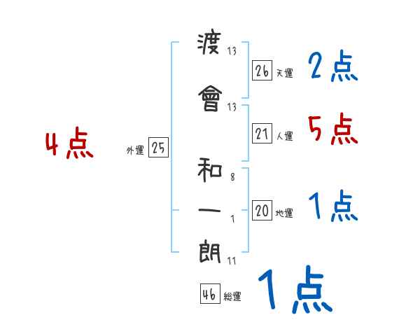 天運![]() | 渡會和一朗さんの天運は26画の2つ星!波瀾万丈かも。信頼できる人を大事にしましょう。 家系が持つ宿命的な運勢を表します。祖先から受け継いだ苗字ですので自分の力が及びません。家柄を象徴します。 |