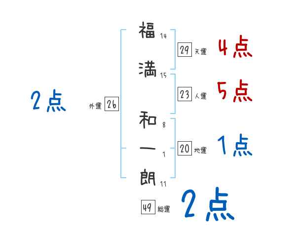 外運![]() | 福満和一朗さんの外運は26画の2つ星!波瀾万丈かも。信頼できる人を大事にしましょう。 生活面を象徴する運勢です。外部から受ける影響力を表し、結婚運、家庭運や職場、環境への順応性を表します。 |