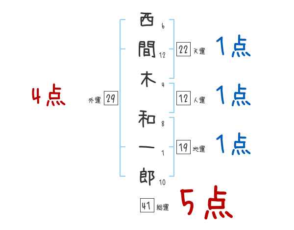 総運![]() | 西間木和一郎さんの総運は41画の5つ星!大志を抱き、目標に向かって実力を発揮し達成する。温和な性格。 あなたの人生を表す1番重要な運勢です。生涯を通じて影響する総合運となり、主に50歳以降の晩年期に影響を及ぼします。 |