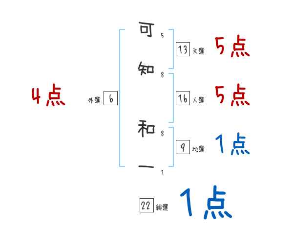 総運![]() | 可知和一さんの総運は22画の1つ星!努力することが苦手ないっぽう手先が器用。芸術性にも優れる。 あなたの人生を表す1番重要な運勢です。生涯を通じて影響する総合運となり、主に50歳以降の晩年期に影響を及ぼします。 |