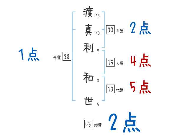天運![]() | 渡真利和世さんの天運は30画の2つ星!浮き沈みの激しさに注意しましょう。 家系が持つ宿命的な運勢を表します。祖先から受け継いだ苗字ですので自分の力が及びません。家柄を象徴します。 |