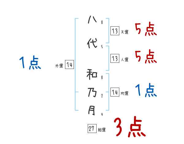天運![]() | 八代和乃月さんの天運は13画の5つ星!才能に恵まれ人気がある。名声を手に入れる。円満な人生。 家系が持つ宿命的な運勢を表します。祖先から受け継いだ苗字ですので自分の力が及びません。家柄を象徴します。 |