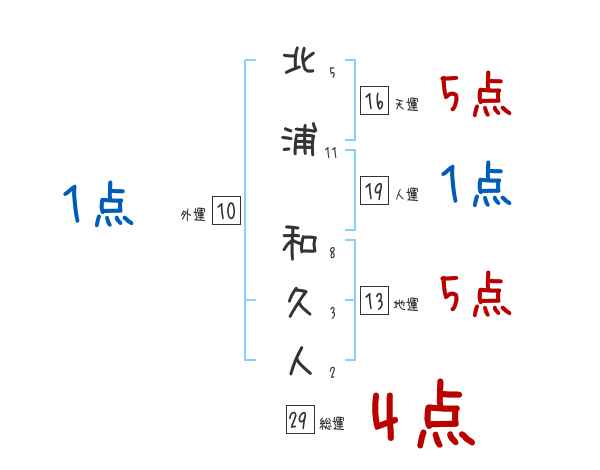 天運![]() | 北浦和久人さんの天運は16画の5つ星!人望が厚く大きく発展する。逆転成功が見える。 家系が持つ宿命的な運勢を表します。祖先から受け継いだ苗字ですので自分の力が及びません。家柄を象徴します。 |