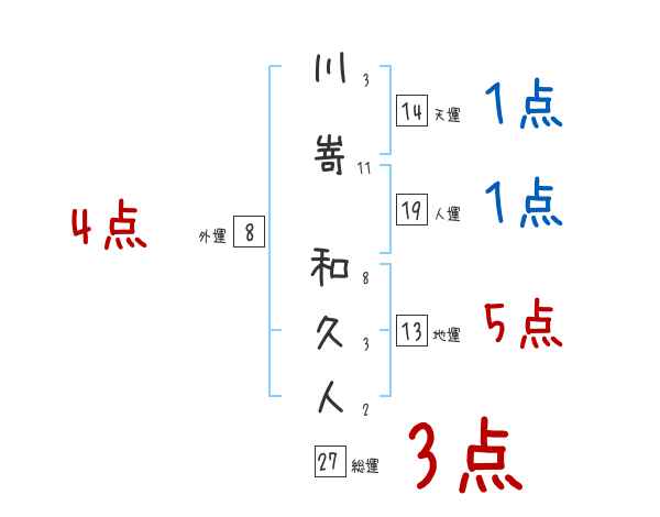天運![]() | 川嵜和久人さんの天運は14画の1つ星!人に対して優しいがストレスを溜め込みがち。人間関係のトラブルを避けるよう気をつけましょう。 家系が持つ宿命的な運勢を表します。祖先から受け継いだ苗字ですので自分の力が及びません。家柄を象徴します。 |