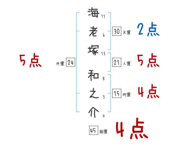 総運![]() | 海老塚和之介さんの総運は45画の4つ星!もくもくと物事を進め達成する。地味な努力家。 あなたの人生を表す1番重要な運勢です。生涯を通じて影響する総合運となり、主に50歳以降の晩年期に影響を及ぼします。 |