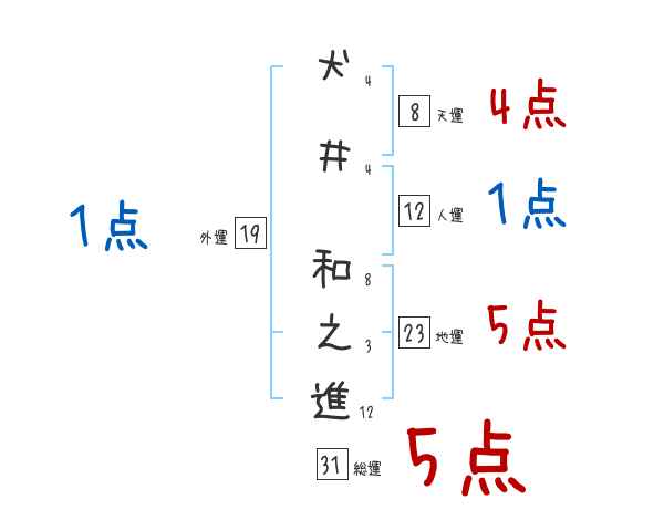 外運![]() | 犬井和之進さんの外運は19画の1つ星!優れた才能を持ちますが、協調性が足りないことも。周りの人と協力する事を意識しましょう。 生活面を象徴する運勢です。外部から受ける影響力を表し、結婚運、家庭運や職場、環境への順応性を表します。 |