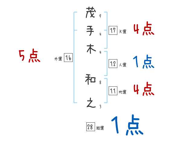 総運![]() | 茂手木和之さんの総運は28画の1つ星!家庭環境に注意。スポーツで活躍できる能力があるかも。 あなたの人生を表す1番重要な運勢です。生涯を通じて影響する総合運となり、主に50歳以降の晩年期に影響を及ぼします。 |