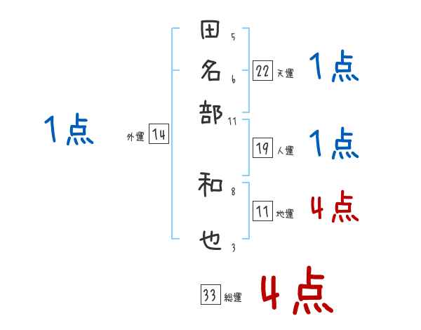 外運![]() | 田名部和也さんの外運は14画の1つ星!人に対して優しいがストレスを溜め込みがち。人間関係のトラブルを避けるよう気をつけましょう。 生活面を象徴する運勢です。外部から受ける影響力を表し、結婚運、家庭運や職場、環境への順応性を表します。 |