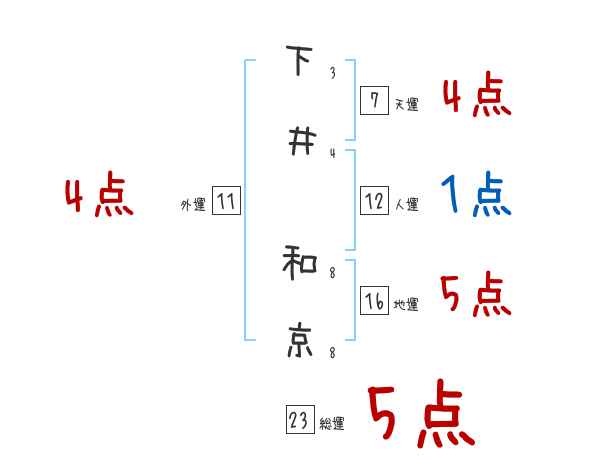 天運![]() | 下井和京さんの天運は7画の4つ星!強い意志や信念を持ち独立心が強い。自立する。 家系が持つ宿命的な運勢を表します。祖先から受け継いだ苗字ですので自分の力が及びません。家柄を象徴します。 |