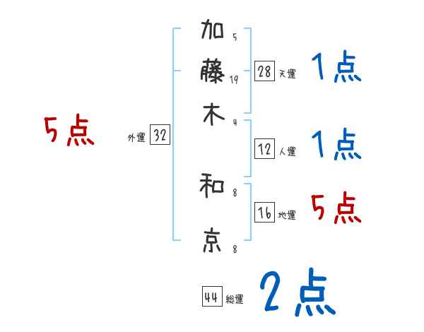 外運![]() | 加藤木和京さんの外運は32画の5つ星!柔軟性があり成功する。チャンスが多く金運が良い。 生活面を象徴する運勢です。外部から受ける影響力を表し、結婚運、家庭運や職場、環境への順応性を表します。 |