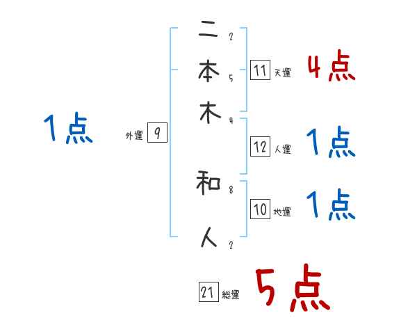 総運![]() | 二本木和人さんの総運は21画の5つ星!統率力がある。独立し成功する。名誉を手に入れる。 あなたの人生を表す1番重要な運勢です。生涯を通じて影響する総合運となり、主に50歳以降の晩年期に影響を及ぼします。 |
