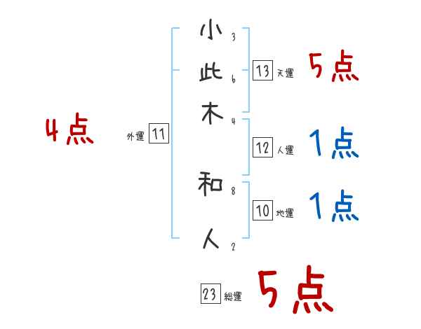 総運![]() | 小此木和人さんの総運は23画の5つ星!想像力に優れ活力がある。一代で成功し名誉を手に入れる。 あなたの人生を表す1番重要な運勢です。生涯を通じて影響する総合運となり、主に50歳以降の晩年期に影響を及ぼします。 |