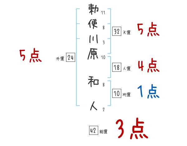 天運![]() | 勅使川原和人さんの天運は32画の5つ星!柔軟性があり成功する。チャンスが多く金運が良い。 家系が持つ宿命的な運勢を表します。祖先から受け継いだ苗字ですので自分の力が及びません。家柄を象徴します。 |