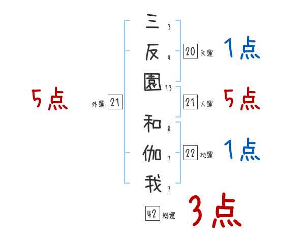 外運![]() | 三反園和伽我さんの外運は21画の5つ星!統率力がある。独立し成功する。名誉を手に入れる。 生活面を象徴する運勢です。外部から受ける影響力を表し、結婚運、家庭運や職場、環境への順応性を表します。 |