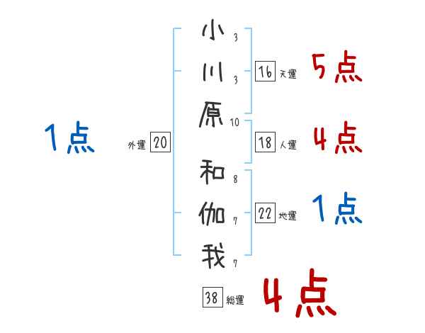 天運![]() | 小川原和伽我さんの天運は16画の5つ星!人望が厚く大きく発展する。逆転成功が見える。 家系が持つ宿命的な運勢を表します。祖先から受け継いだ苗字ですので自分の力が及びません。家柄を象徴します。 |