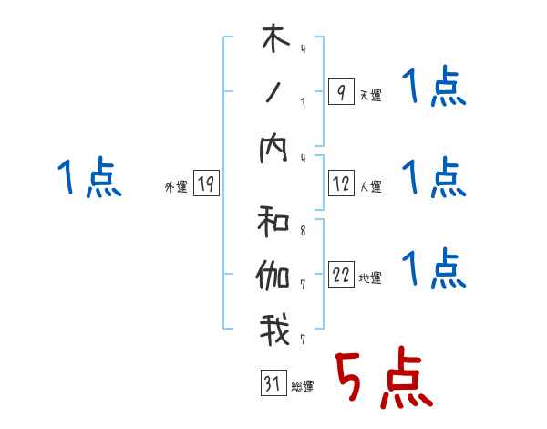 地運![]() | 木ノ内和伽我さんの地運は22画の1つ星!努力することが苦手ないっぽう手先が器用。芸術性にも優れる。 個性を表す基礎的な運勢です。性格形成や対人関係、行動力など家庭環境に影響されます。主に誕生してから20歳くらいまでの若年期の運勢を表します。 |