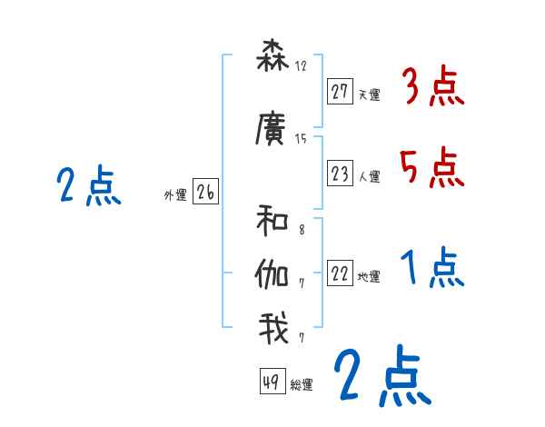 外運![]() | 森廣和伽我さんの外運は26画の2つ星!波瀾万丈かも。信頼できる人を大事にしましょう。 生活面を象徴する運勢です。外部から受ける影響力を表し、結婚運、家庭運や職場、環境への順応性を表します。 |