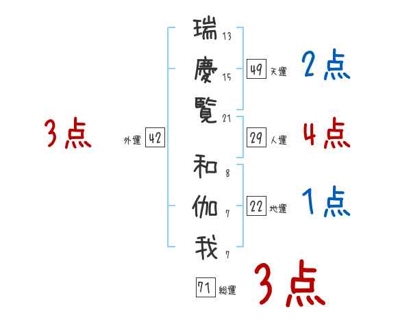総運![]() | 瑞慶覧和伽我さんの総運は71画の3つ星!力が弱く小心者だが、いずれ安泰を手に入れる。 あなたの人生を表す1番重要な運勢です。生涯を通じて影響する総合運となり、主に50歳以降の晩年期に影響を及ぼします。 |
